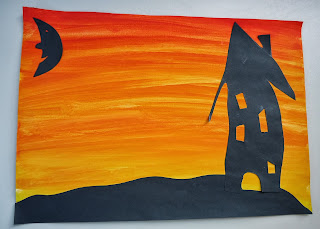 Während der Hintergrund trocknet, werden die gewünschten Formen auf schwarzes Tonpapier gemalt und ausgeschnitten. Da es sich um ein Halloweenbild handelt, können die Häuser, Bäume und alle anderen Dinge gerne krumm und schief sein. Nein, ich finde sogar sie müssen krumm und schief sein.