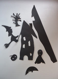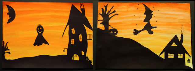 Passend zu dieser Szene malten die Zwerge und ich *Gruselschattenbilder*. Bei uns fliegen jetzt jedoch nicht nur Hexen, sondern auch Gespenster, Zauberer und Kürbisse durch die Nacht.
