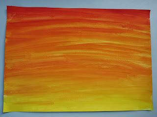 Hintergrund mit Wasserfarbe in den Farben gelb-orange-rot malen. Hierbei ist darauf zu achten, dass die Übergange fliessend sind. Unbedingt von unten nach oben immer dunkler werden.