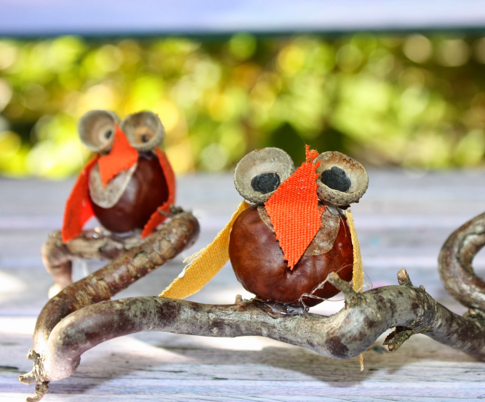 Als Tipp: wenn ihr zuvor zwei Ringschrauben in die äusseren beiden Kastanien schraubt, kann man die Eulenfamilie beispielsweise ans Fenster hängen.