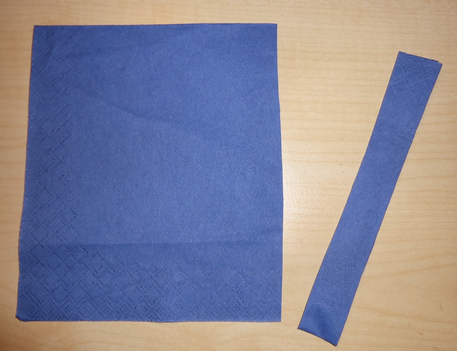 Für die Mütze wird eine Serviette mittig halbiert. Anschliessend einen schmalen Streifen abschneiden. Dieser Streifen dient später als Schal.