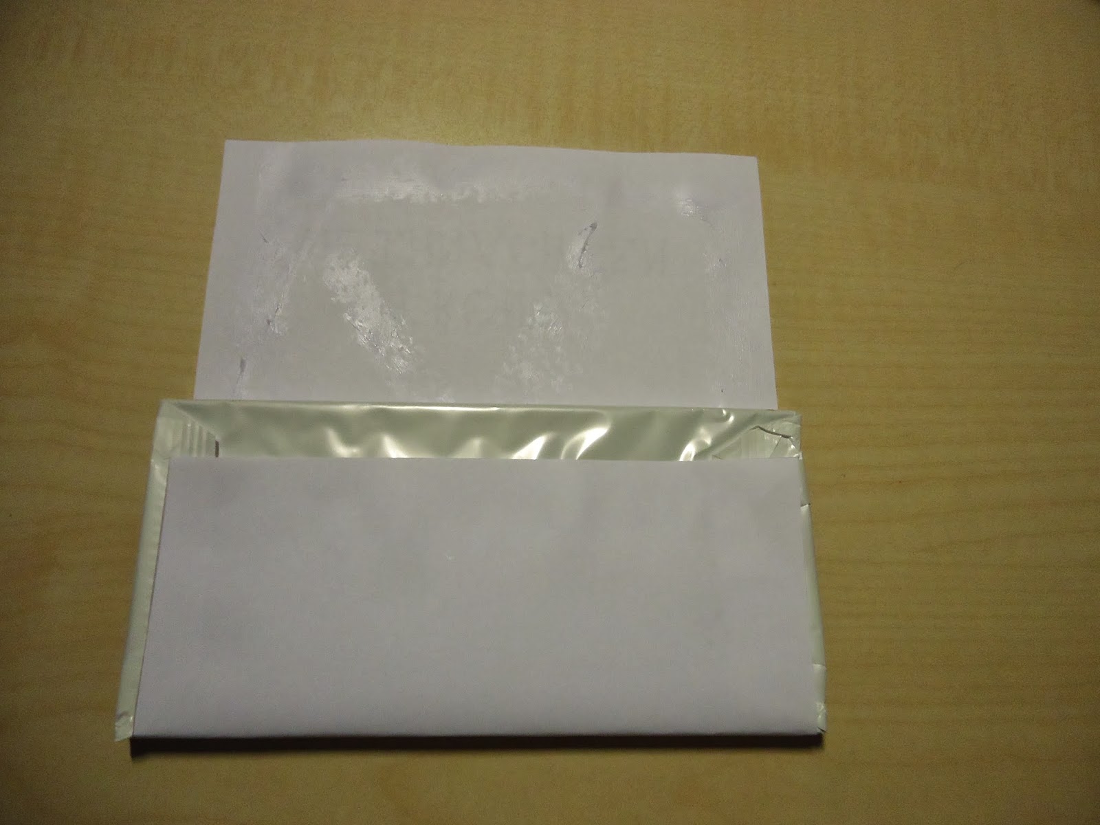 Schokolade in die Vorlage wickeln (Auchtung: erst die Vorderseite anpassen, dann den weissen Flügel einklappen und erst dann den Flügel mit Text).