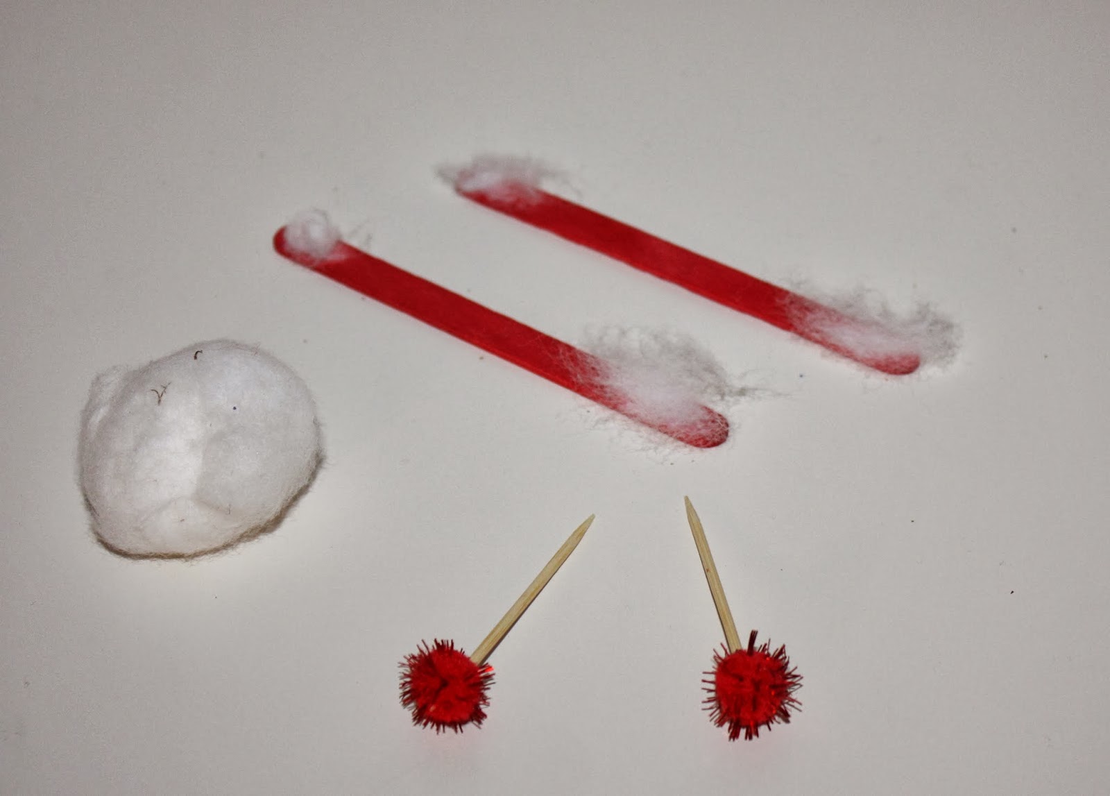Nun die Holzstäbe nach Wunsch anmalen (oder schon angemalt kaufen) und vorne und hinten mit etwas Watte bekleben. Das simuliert den Schnee, der bei der wilden Fahrt aufgegabelt wurde.