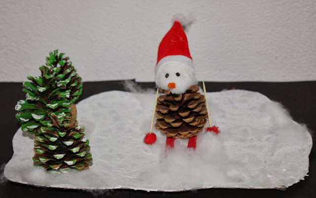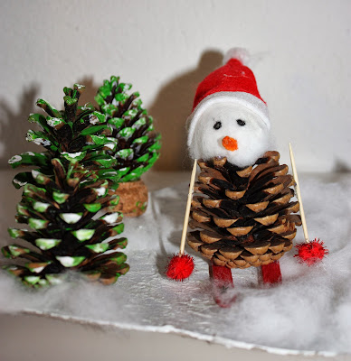 Die Tannenbäume bestehen (wir könnte es auch anders sein) aus Föhrenzapfen, die ich grün und weiss bemalte. Ein halbierter Korken dient als Stamm.