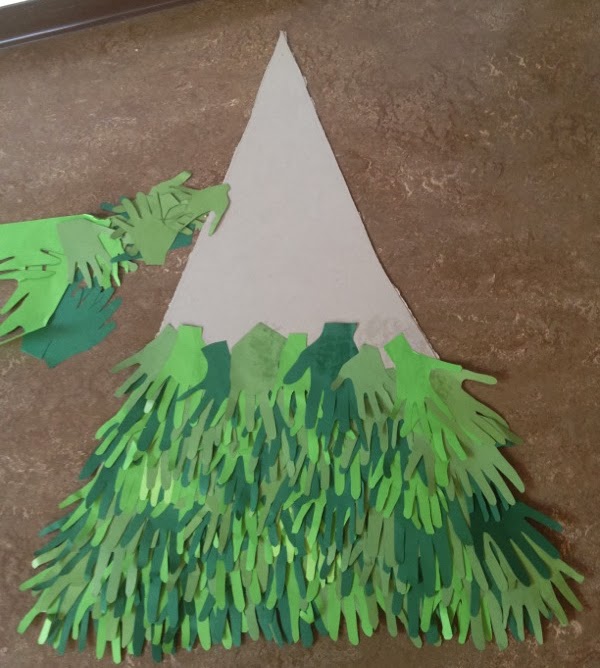 - Nun werden Hände gesammelt. Jedes Kind musste Zuhause mindestens zehn Papier-Hände anfertigen. Dabei lud ich sie ein, auch die Hände von ihren Mamas, Papas, Omas, Opas und Geschwistern auf das grüne Papier zu übertragen und auszuschneiden. Dadurch wird aus dem Klassen-Tannenbaum nämlich ein Klassen-Familien-Tannenbaum.