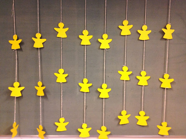 Bei uns ist es üblich, dass wir die Schulhausgänge zur Weihnachtszeit gemeinsam dekorieren. Unter anderem mit diesen himmlischen Engelsgirlanden.