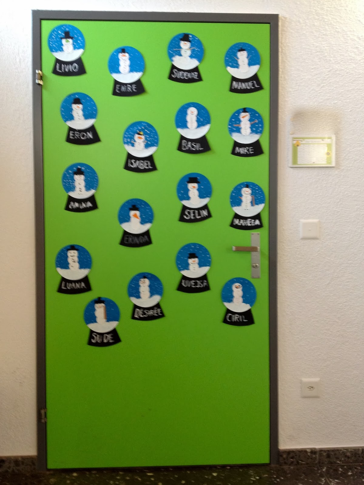 Wir geben die Hoffnung jedenfalls nicht auf und habe unsere Klassenzimmertür mit Papier-Schneekugeln geschmückt. Wenn es draussen nicht schneit, dann machen wir uns „unseren Schnee“ eben selber.