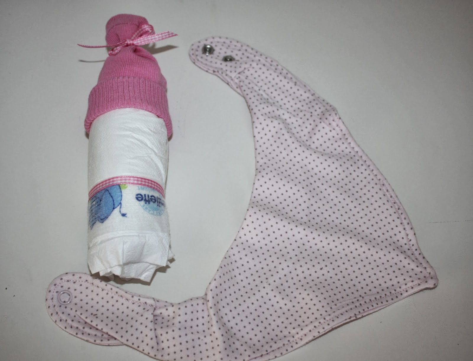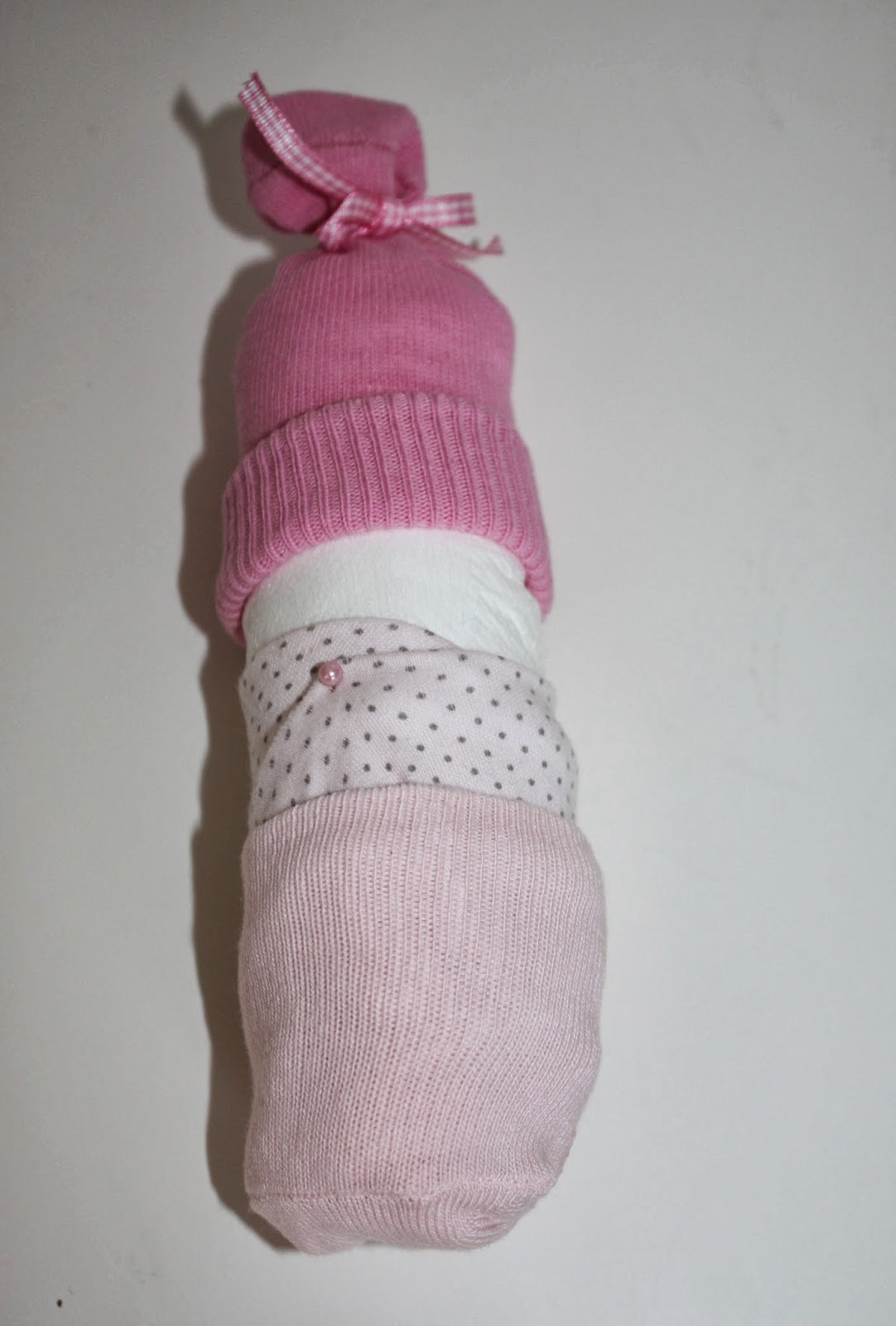 Zwei Windeln zusammenrollen und festbinden. Ein Söckchen über die Windel stülpen und im oberen Drittel eine Schleife machen. Die Schleife dient lediglich der Optik.