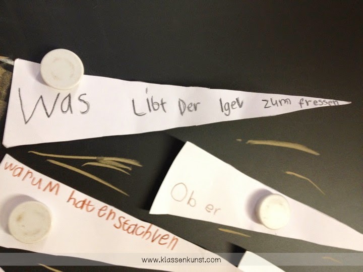In einem Kurs über den Igel, wurden wir gefragt, was wir von diesem Tag erwarten, was uns interessiert und welche Fragen wir haben. Unsere Fragen und Gedanken mussten wir auf Dreiecke schreiben, die später die Stacheln des Igels darstellten. Die Fragen wurden gesammelt und an der Tafel zu einem Igel angeordnet.