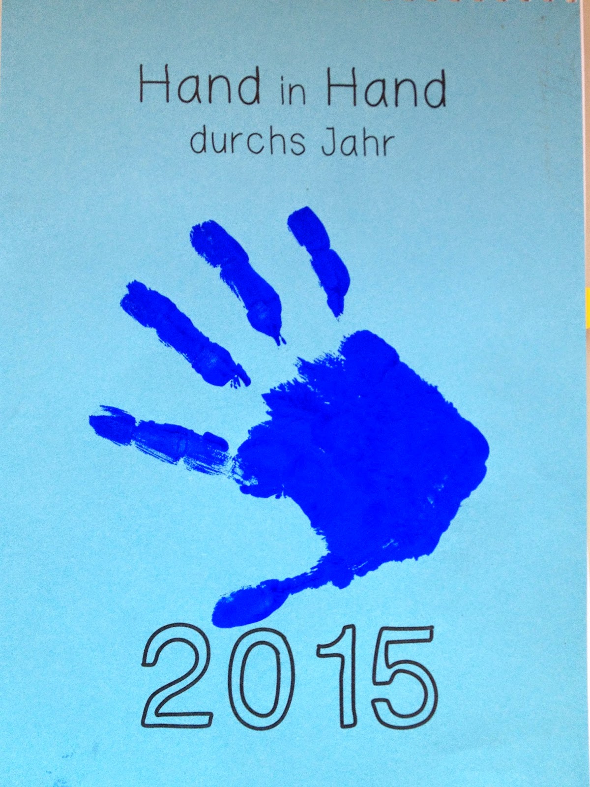 Die Titelseite des Kalenders besteht aus einem einfachen Handabdruck. So gestaltet, wie es den Kindern gefiel. Mal bunt, mal einfarbig, mal mit Mustern.