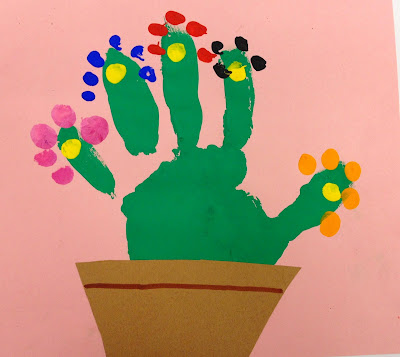 Dazu wird die Hand grün angemalt. Daraus entstehen der Stiehl und die Blätter. Die Blütenblätter werden mit dem Finger in den Wunschfarben getupft. Optional kann ein Blumentopf aus Buntpapier gebastelt werden.