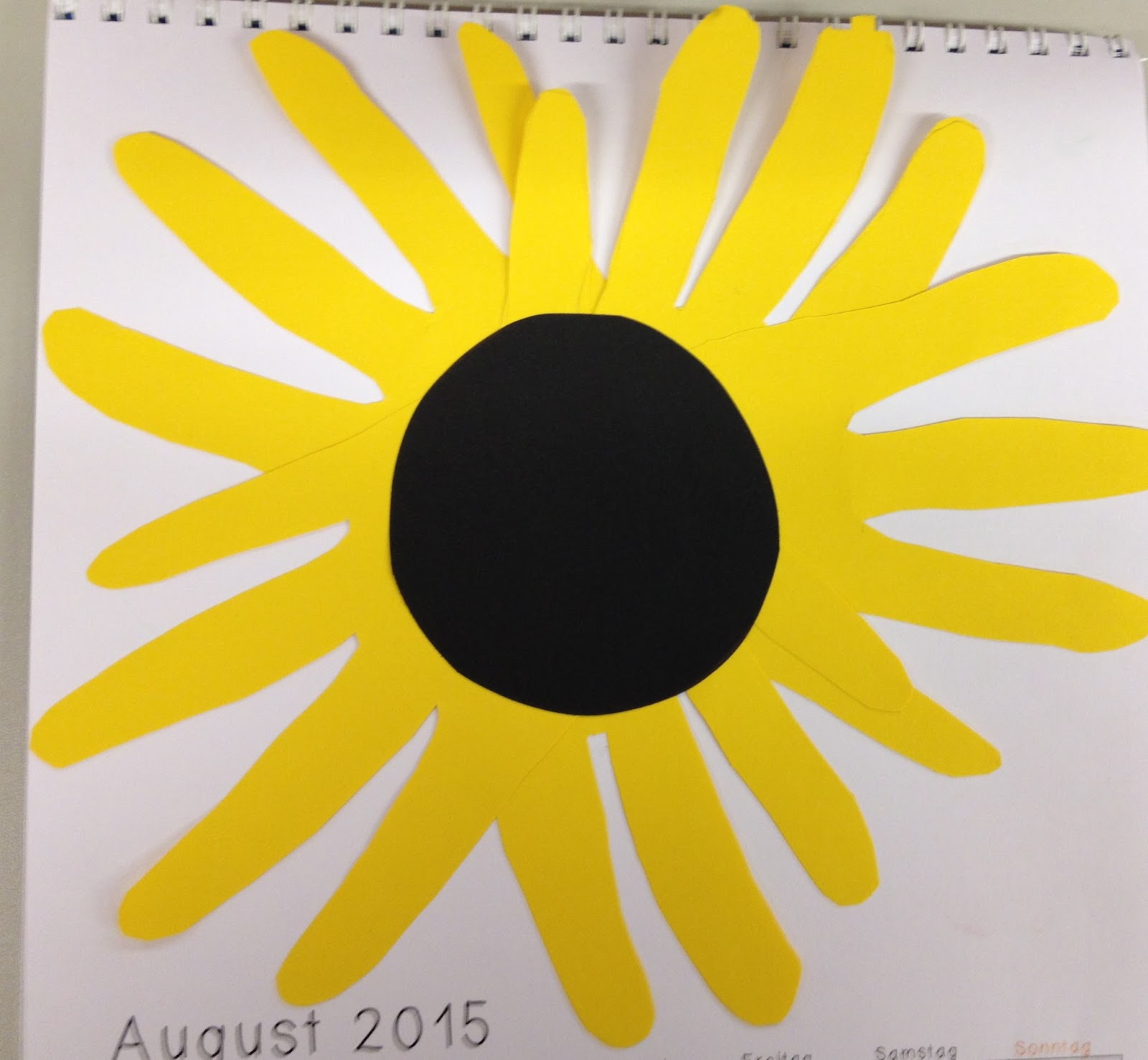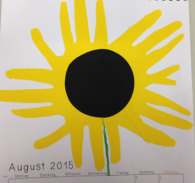Dazu wurde die Hand auf ein gelbes Blatt Papier gelegt, mit einem Bleistift umrandet und anschliessend ausgeschnitten. Die ausgeschnittenen Hände werden dann kreisförmig angeordnet und wenn nötig noch etwas gekürzt. Ein schwarzer oder brauner Kreis in der Mitte komplettiert die Sonnenblume. Optional könnten Sonnenblumen-Kerne aufgeklebt oder gezeichnet werden. Heute würde ich zudem einen blauen Hintergrund wählen.