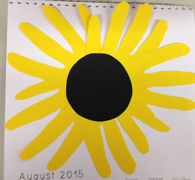 Statt einer Sonnenblume kann aus den gelben Händen auch eine Sonne gebastelt werden. Statt eines schwarzen Kreises würde ein gelber Kreis aufgeklebt und mit einem niedlichen Gesicht verziert werden.