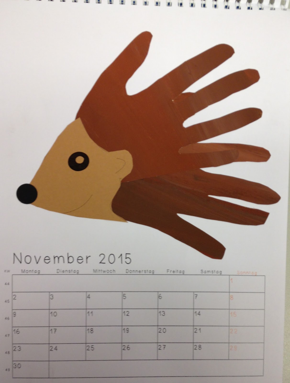 Handabdrücke aus braunem Papier ausschneiden. Um einen noch schöneren Effekt zu erzielen, kann das Papier zuvor selber mit verschiedenen Brauntönen angemalt werden. Die meisten meiner Kinder entschieden sich für dieses Weg. Danach wird entweder das Igelgesicht von Hand gezeichnet oder mit einer Schablone übertragen. Nun wird der niedliche Igel nur noch auf das Kalenderblatt geklebt und fertig. Ein süsser Igel im Herbst!