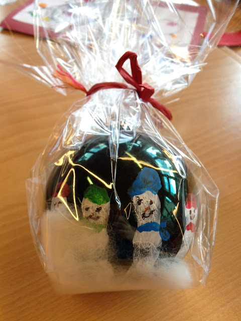Wir prÀsentierten die Kugel auf einer Schnee-Watte-Decke und wickelten sie in durchsichtige Geschenkfolie ein.