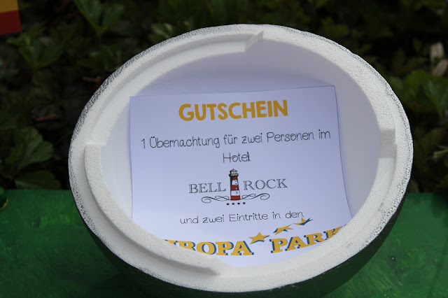 Ich überlegte sehr lange, wie der Gutschein hübsch präsentiert werden könnte. Am liebsten hätte ich ja eine Achterbahn gebaut ;). Ich entschied mich dann für eine etwas einfachere Variante und entschied mich für die Eurosat-Bahn (das ist diese Bahn in der grossen Kugel).