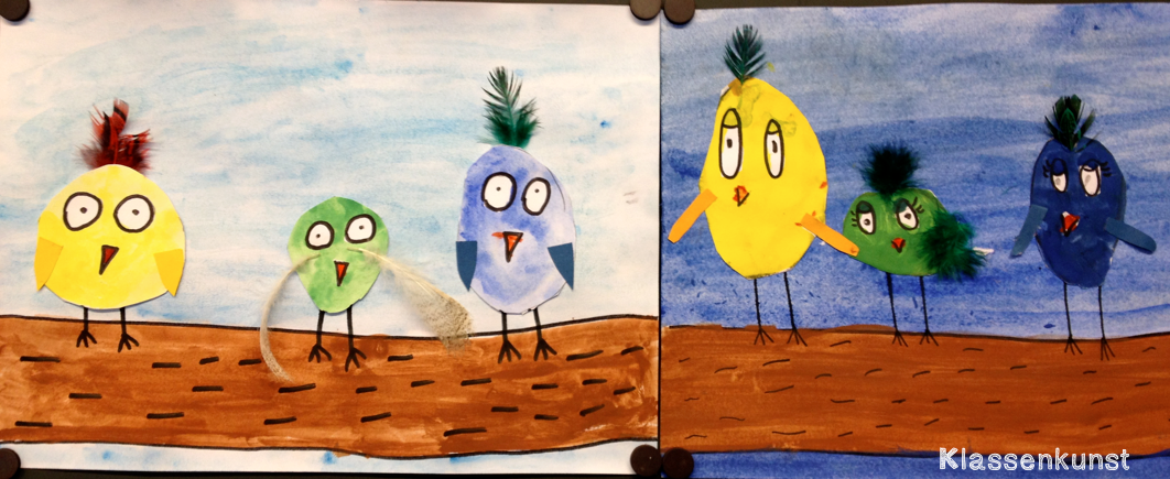 Die Vögel sind so knuffig und inspirierten mich zu folgender Misch-Idee. Es sitzen jeweils drei Vögelchen auf einem Ast. Die Farbe des Vogels in der Mitte (das Vogelkind) setzt sich aus den Farben vom Vogel rechts (Vogelpapa) und vom Vogel links (Vogelmama) zusammen. Und: um eine Art Klassenbild zu erstellen, befinden sich die einzelnen Äste auf ungefähr gleicher Höhe. So sieht es aus, als ob alle Vögel auf einem riesigen Ast sitzen.